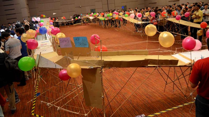 In Bridging the Divide teams build a bridge a section of a bridge to required customer specifications while overcoming limited resources, communication barriers and strict timelines. Bridges are creatively designed, decorated and branded by each team, with awards being given for the most creative engineering design, best branding, and most efficient use of resources.