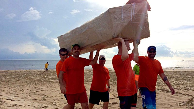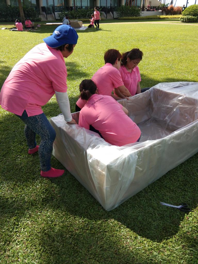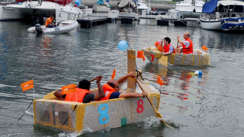 13 ladies from Abbot Laboratories get together to construct, decorate and race perfect cardboard boats.